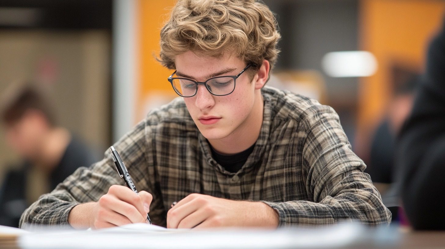 The student is writing in a notebook during a lecture at the university